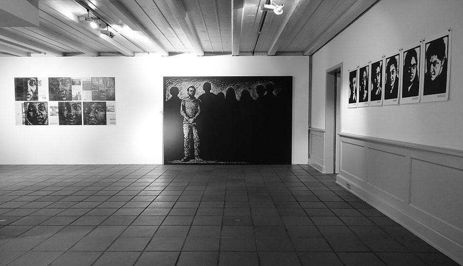 Mein Beitrag sind eine Installation mit Bild und Ton zum Thema "Bootsflüchtlinge" und Porträts von AsylbewerberInnen aus Bern, gedruckt auf Zeitungsbögen mit aktuellen Berichten zum Thema.