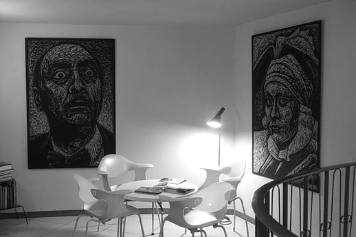Zeitgleich waren im Foyer, sowie im Vorraum zur Galerie, Holzschnitte mit Porträts aus Filmen von Federico Fellini zu sehen.