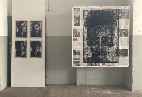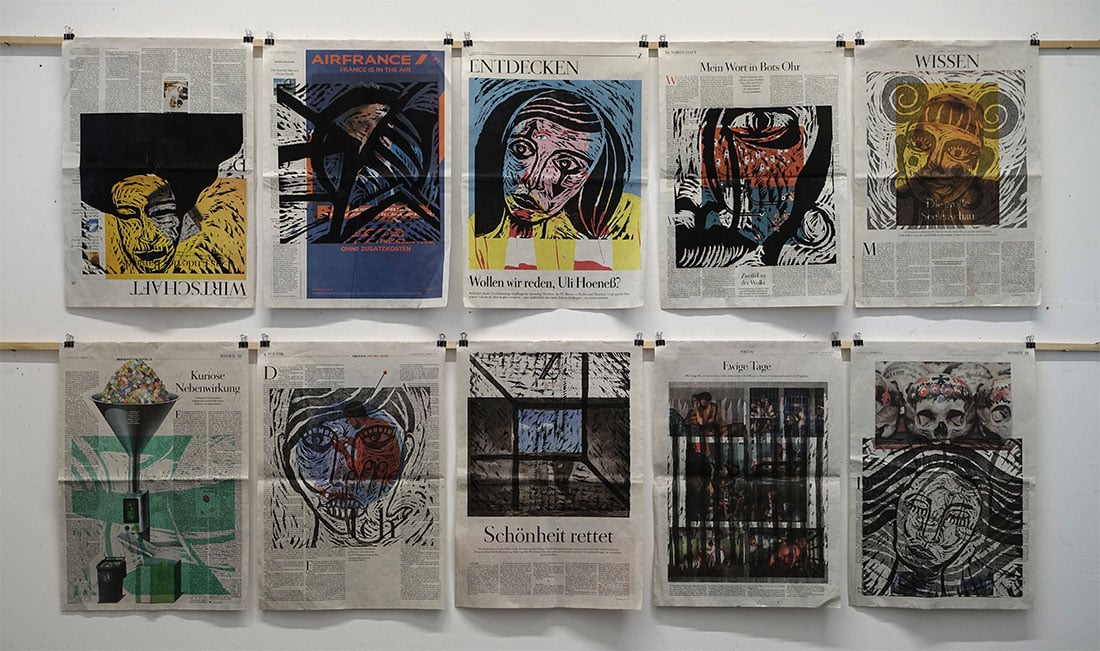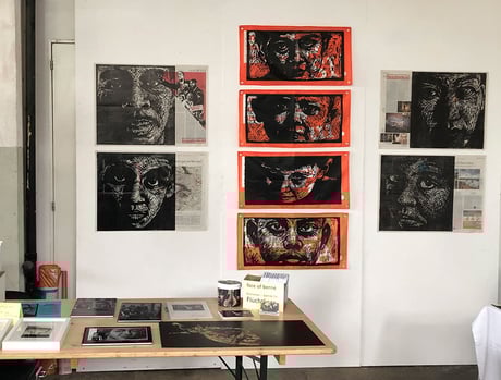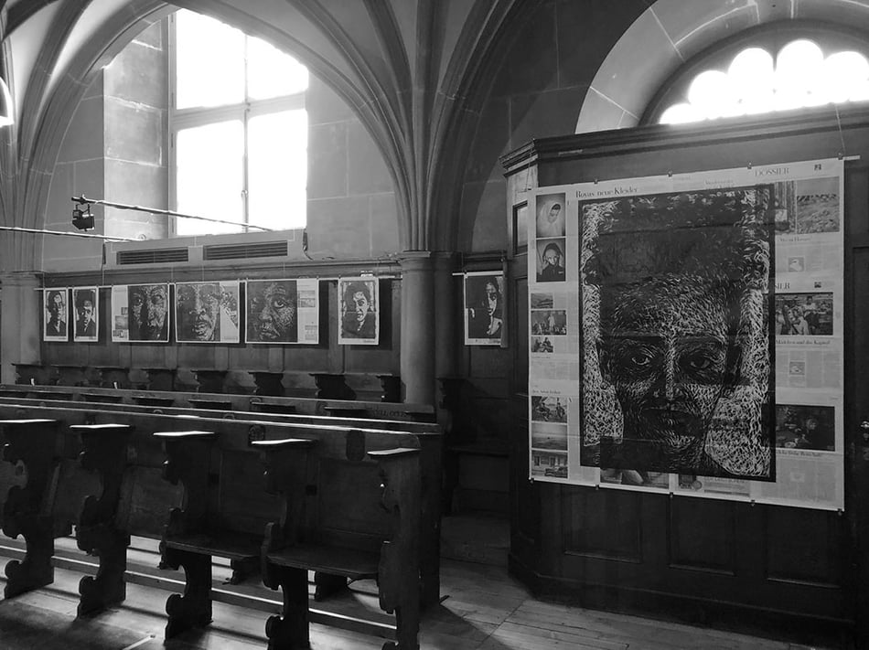 Mein Beitrag zur Ausstellung sind Porträts von geflüchteten Menschen - Holzdrucke auf Zeitung.