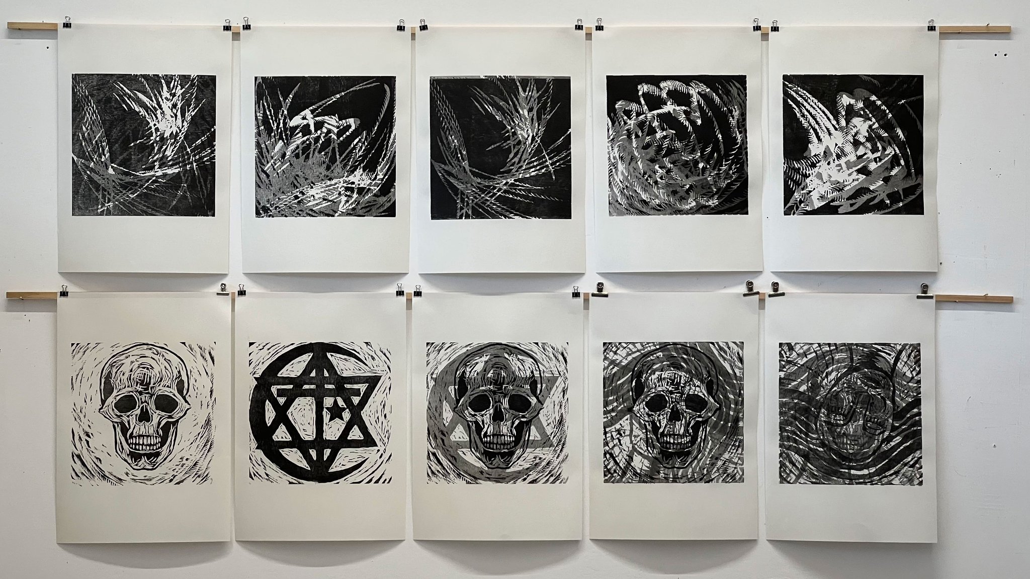 In den zwei Wochen habe ich kleine Holzschnitte mit der Kettensäge geschnitten und gedruckt und dabei mit übereinanderdrucken auf weisses Papier oder Zeitungsbögen experimentiert.